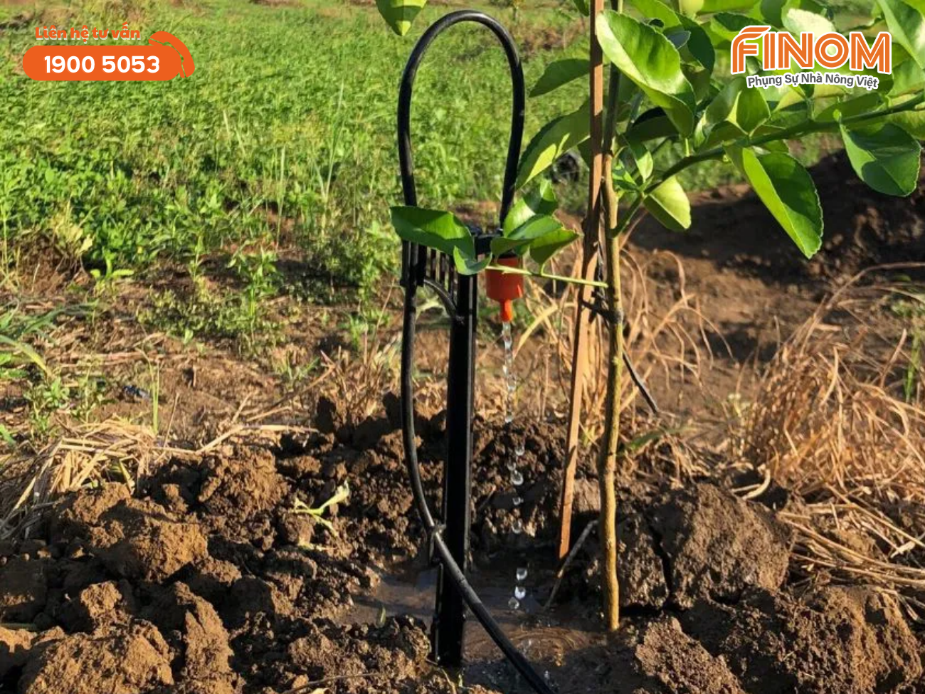 - Sau 1.5 năm khi cây chanh phủ tán, bộ rễ lan rộng, gắn thêm béc FN400 để tăng bán kính tưới lên 1 mét.