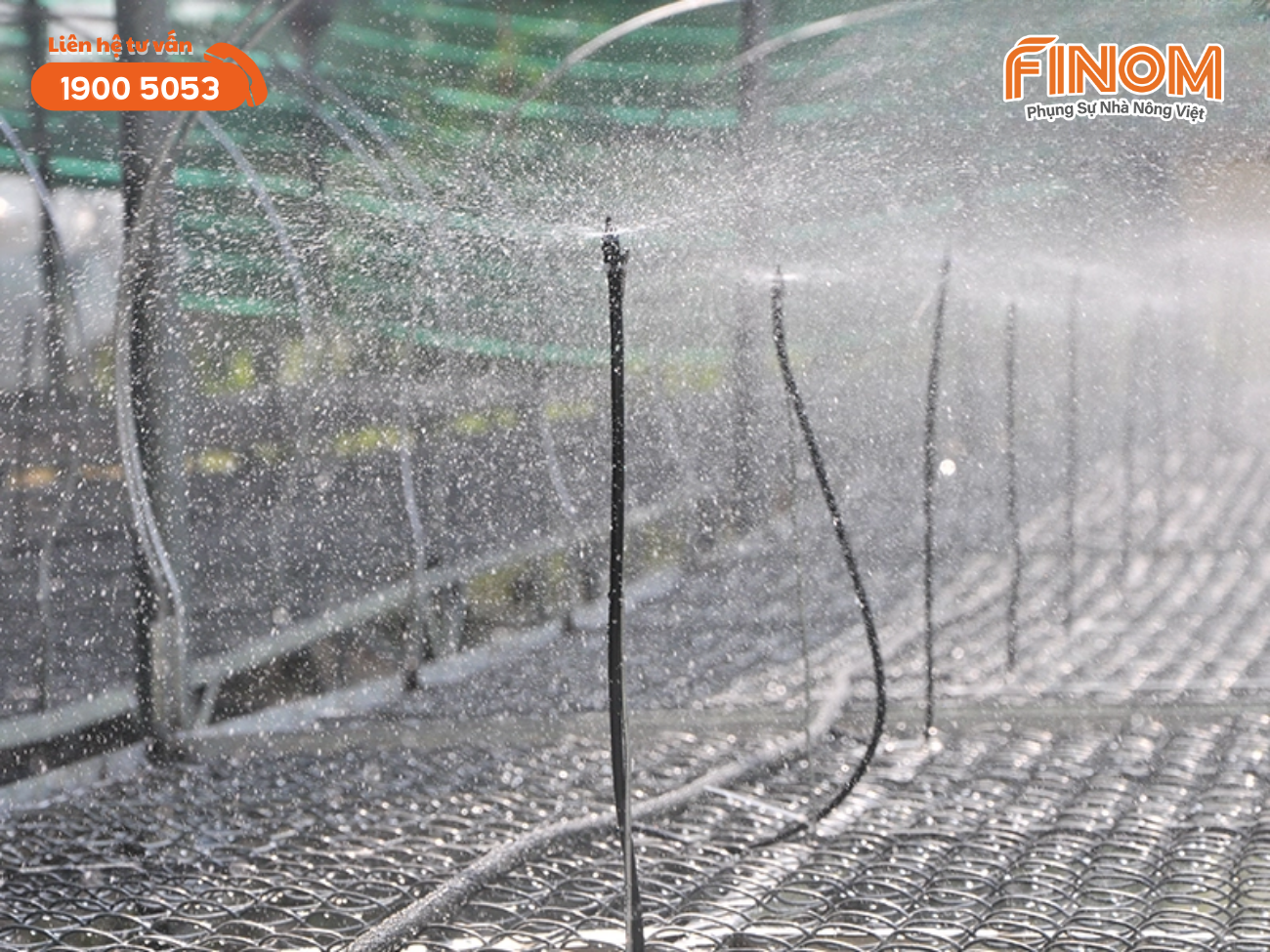 - Tưới phun nước hạt mịn cho cây con trồng trong giá thể, sử dụng béc tưới cục bộ FN100 (Israel) cung cấp nước cho cây con và giảm nhiệt độ vườn ươm.