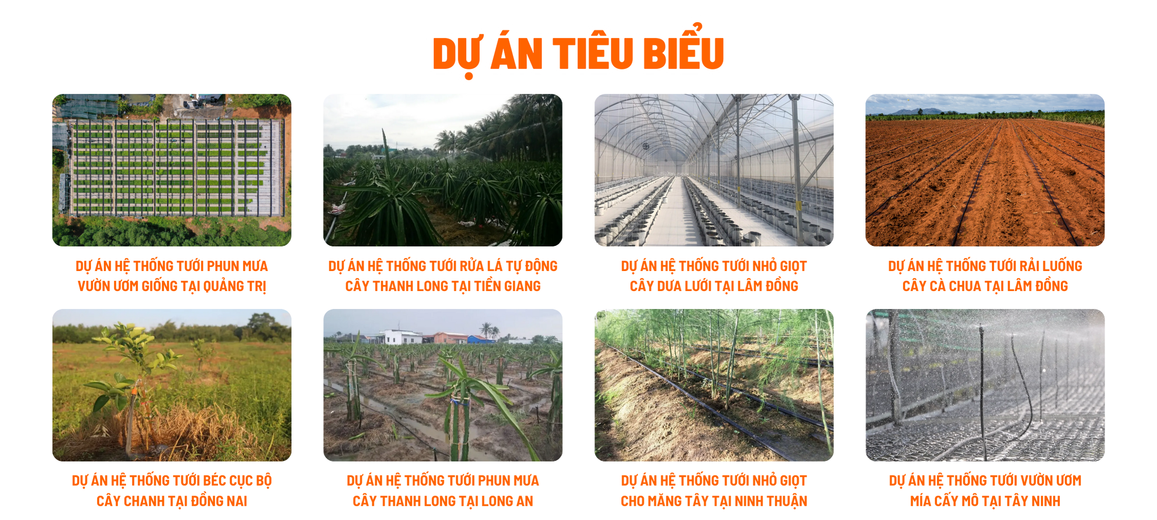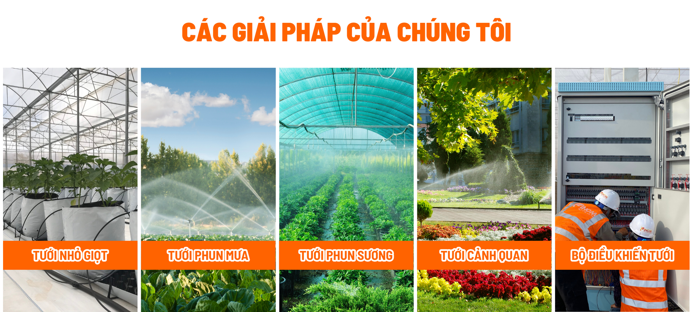 Chúng tôi thiết kế và cung cấp giải pháp tưới toàn diện cho nhiều đối tượng cây trồng khác nhau, ngoài đồng ruộng và trong nhà màng: tưới nhỏ giọt, tưới phun mưa, tưới phun sương làm mát, bộ điều khiển tưới & châm phân tự động:
