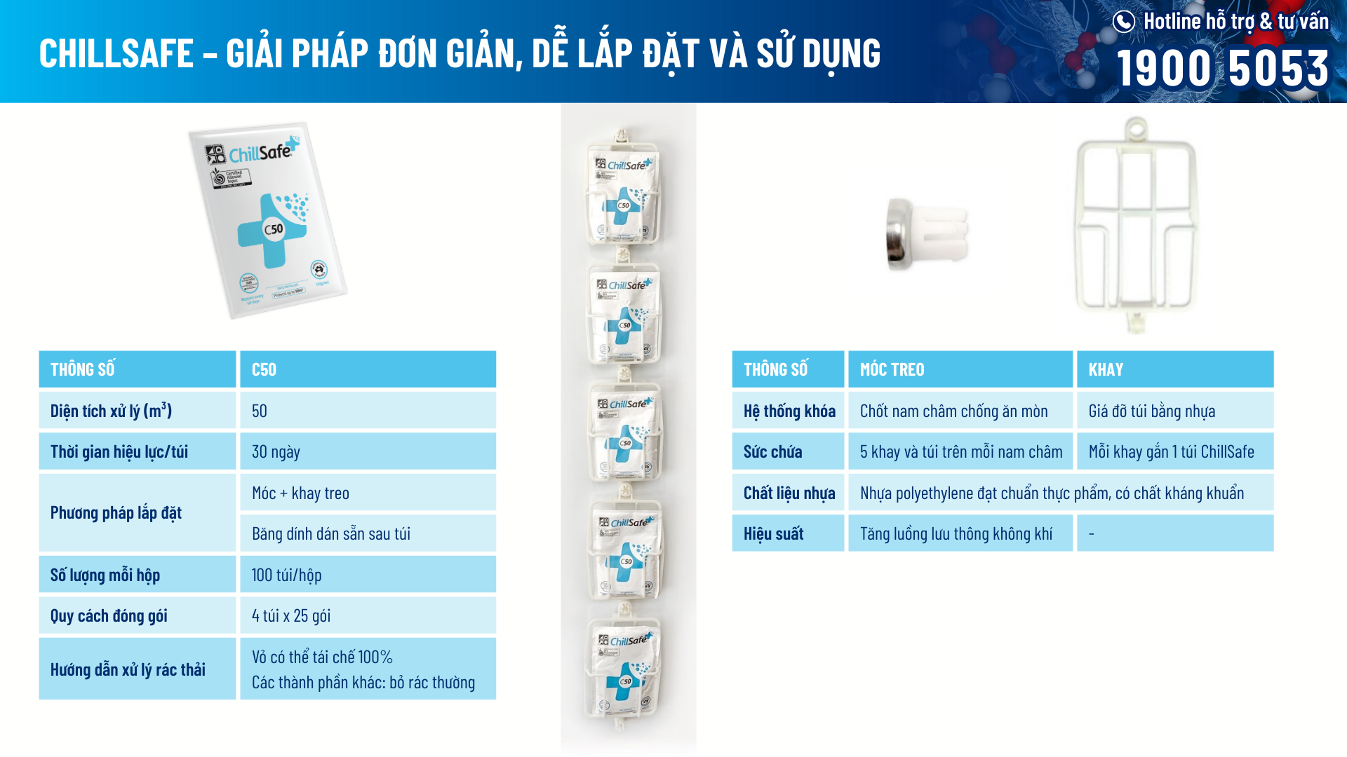 Gắn móc treo tại vị trí cao, gần dàn lạnh hoặc các điểm có lưu thông không khí mạnh, sau đó treo khay túi ChillSafe để đạt hiệu quả phát tán hơi diệt khuẩn tối đa. Mỗi móc có thể treo chuỗi tối đa 5 khay, thuận tiện khi xử lý không gian lớn.