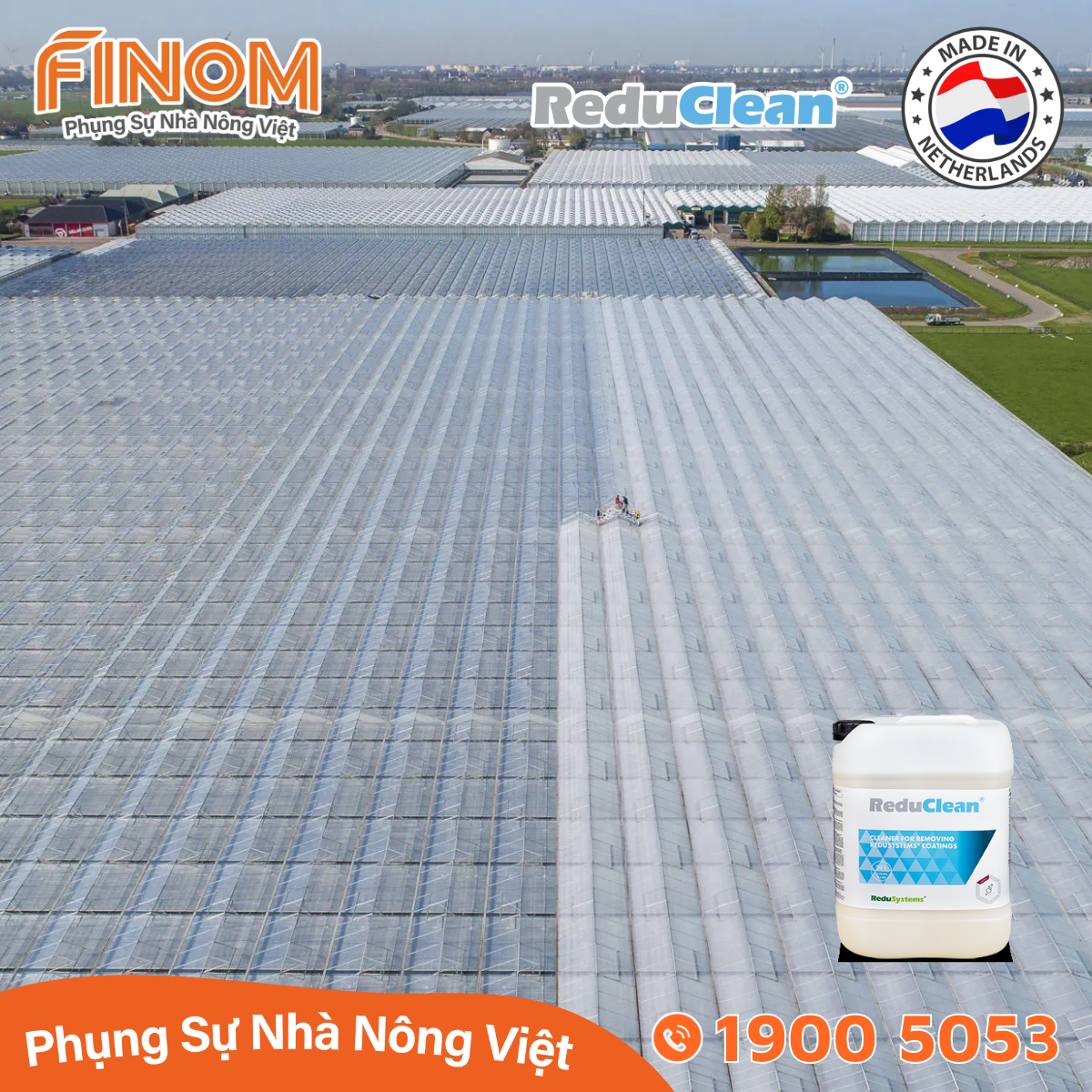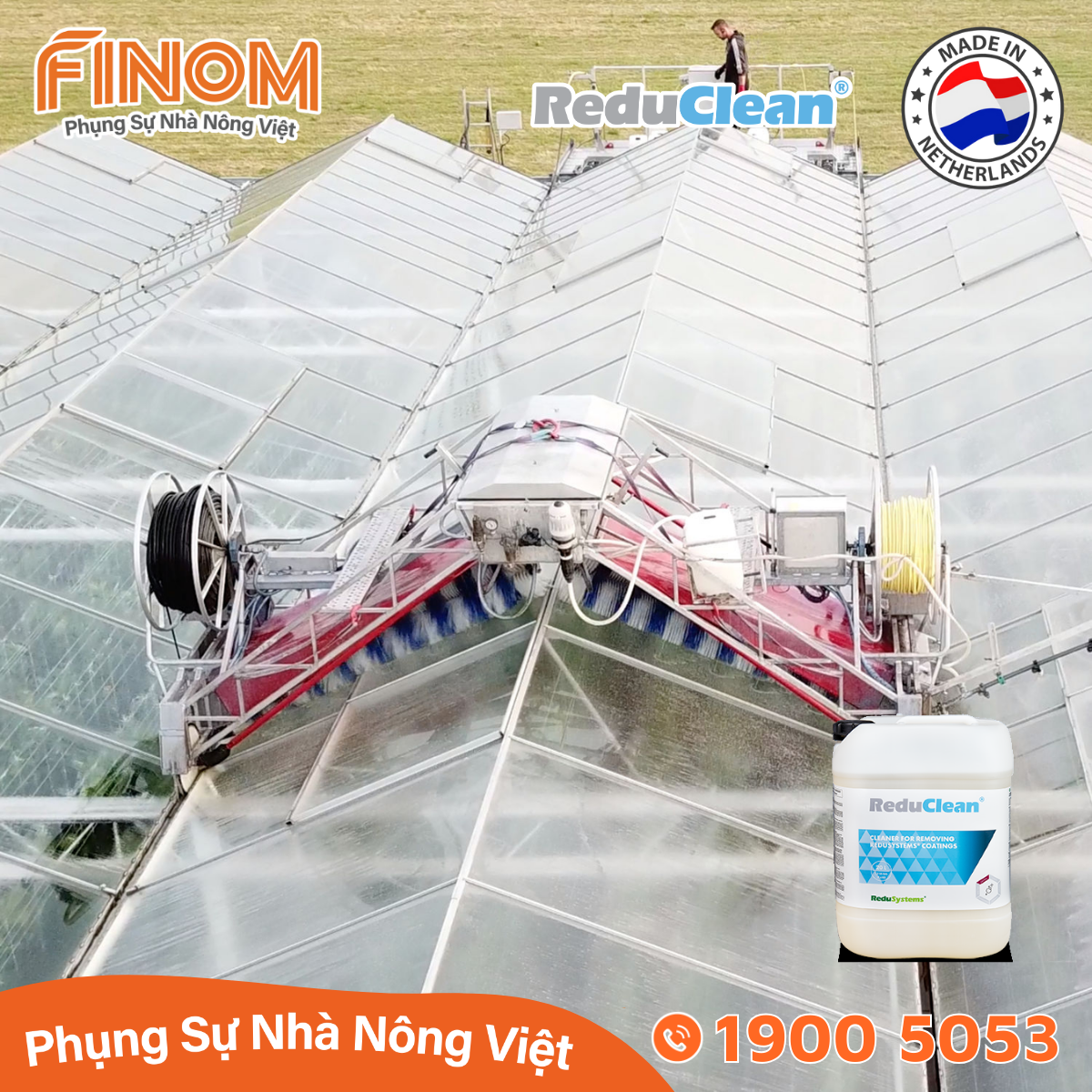 Dung dịch rửa sơn chống nóng chuyên dụng ReduClean giúp dễ dàng loại bỏ lớp sơn chống nóng ReduHeat khỏi mái nhà kính (Vì ReduHeat có khả năng chống mài mòn rất cao, chúng phải được loại bỏ vào cuối mùa nắng khi không còn cần thiết nữa). ReduClean đảm bảo lớp phủ Reduheat được hòa tan, sau đó dùng chổi vệ sinh nhà màng để rửa trôi lớp phủ đã tan rã vì ReduHeat không bị rửa trôi bởi mưa và các dung dịch tẩy rửa khác.