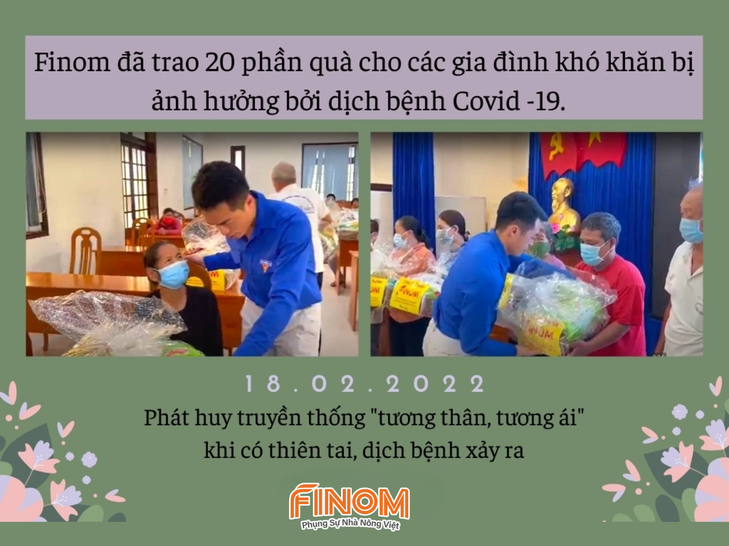 Tại huyện đảo Phú Quý, Finom đã trao 20 phần quà cho các gia đình khó khăn bị ảnh hưởng bởi dịch bệnh Covid-19. Phát huy truyền thống "tương thân, tương ái", và vai trò trợ giúp lẫn nhau "lá lành đùm lá rách" khi có thiên tai, dịch bệnh xảy ra.