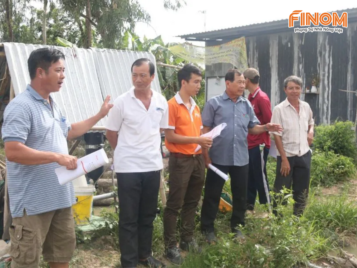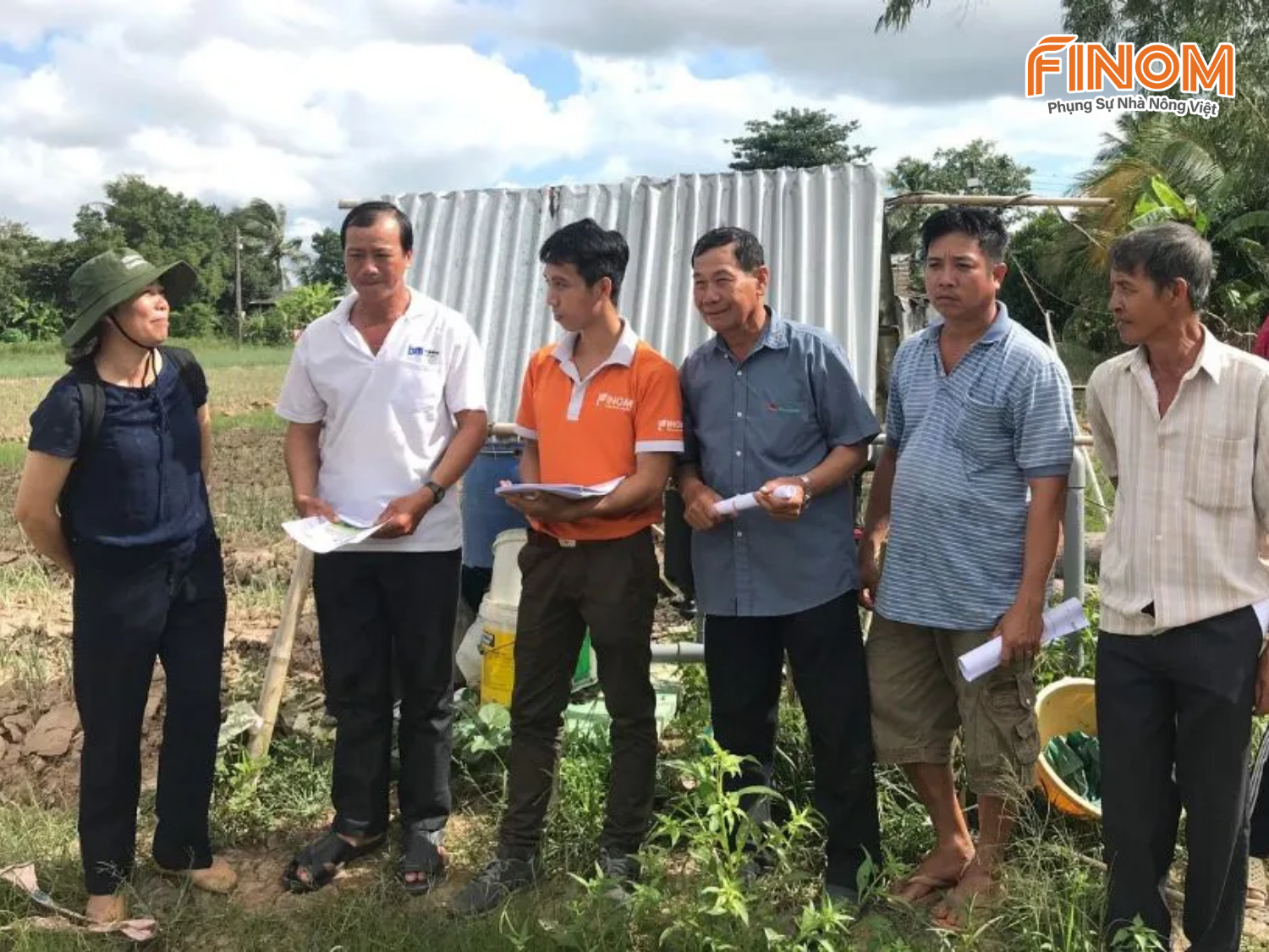 Đại diện đội ngũ kỹ sư Finom trao đổi với bà con nông dân về hiệu quả tưới nhỏ giọt trên cây hành
